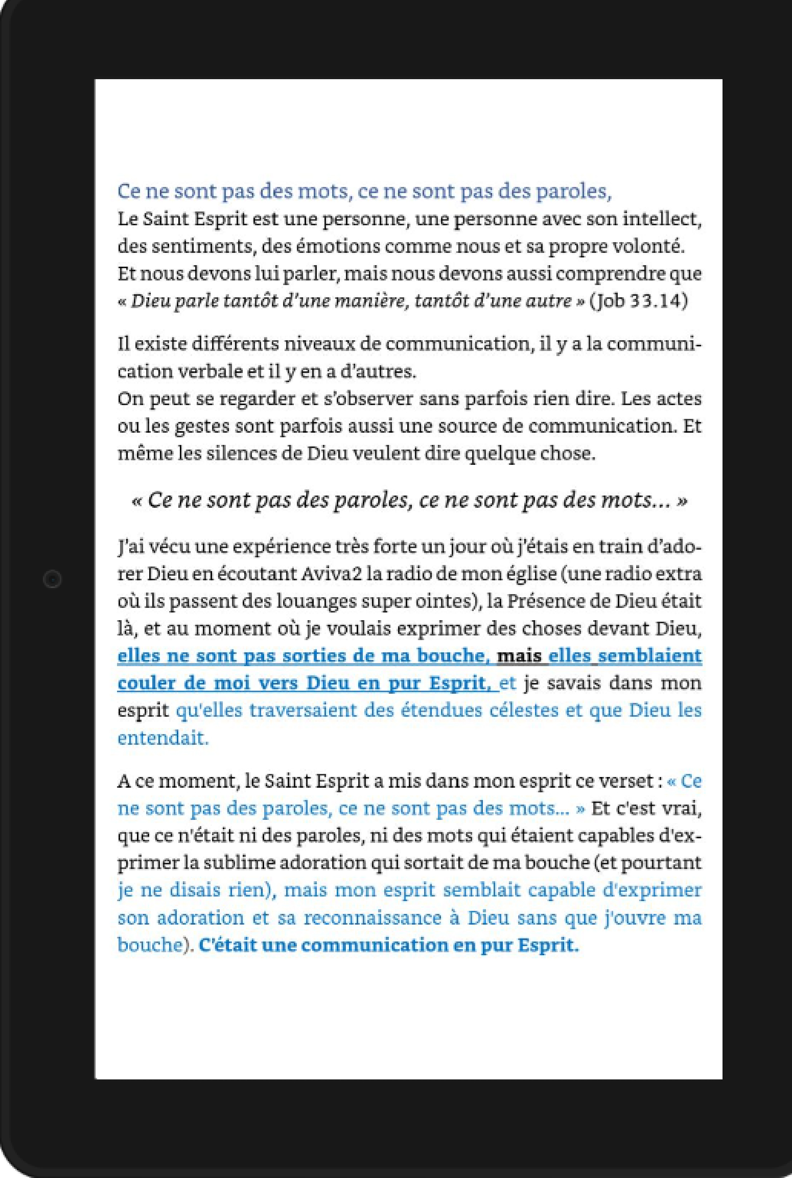 Commencez à vivre une amitié profonde, une communion de tous les instants avec le Saint Esprit. Ne vous cantonnez pas à la théorie et à la religion mais commencez à vivre dans la réalité ce que la Bible dit.